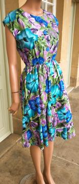 1980s Chinese? made collarless pegged A-line dress multi-colour floral print big buttons UK size 10-12