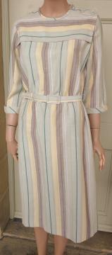1980s Littlewoods apron neckline sheath dress pale green with horizontal vertical stripes & belt UK size 12