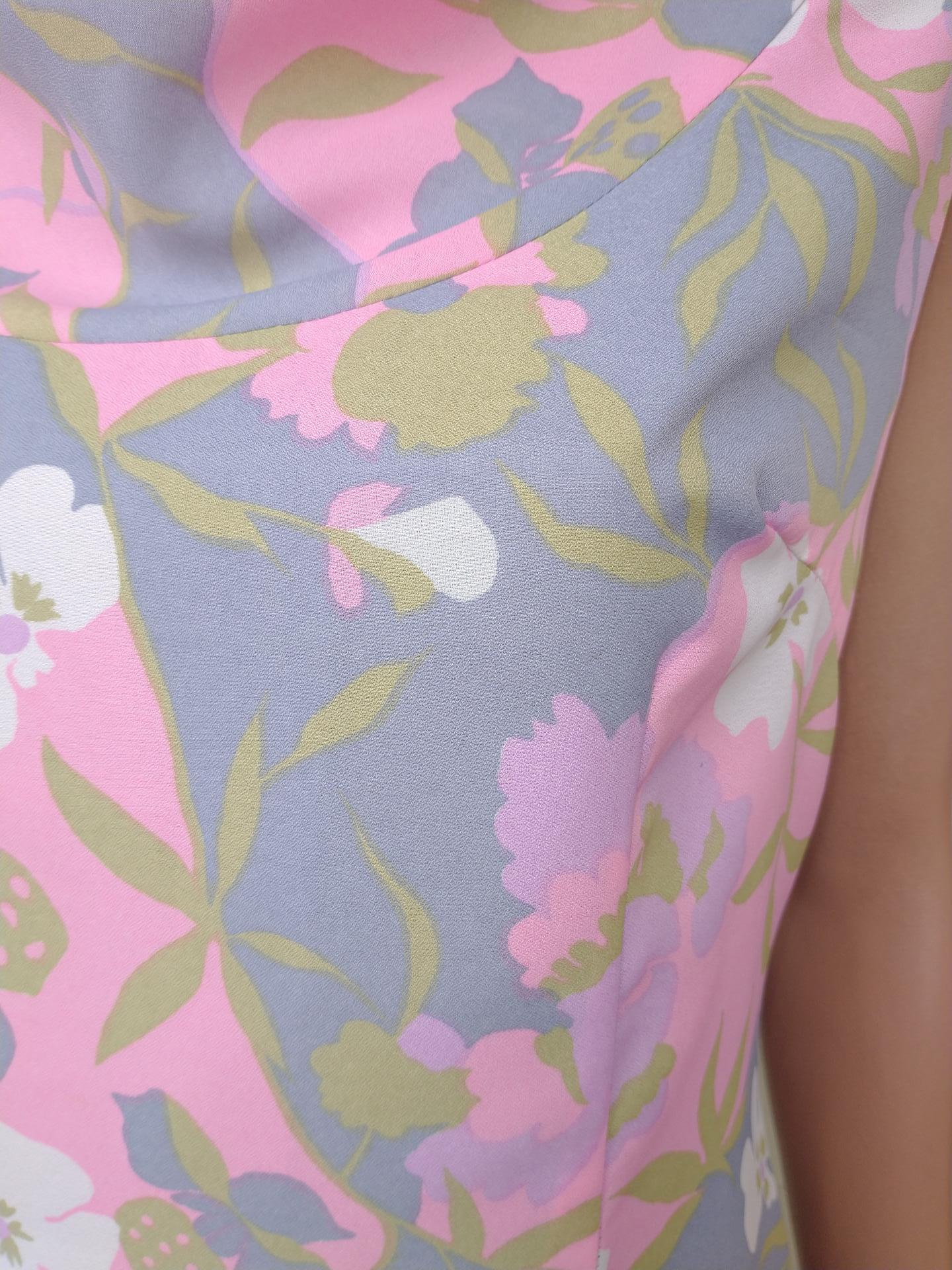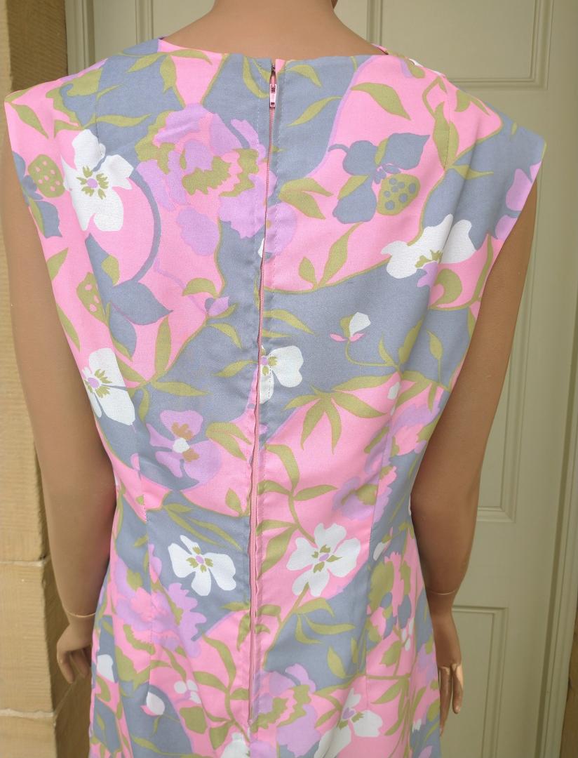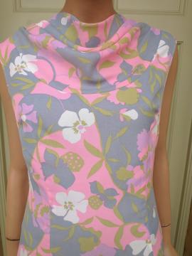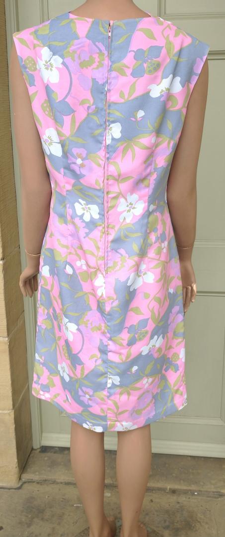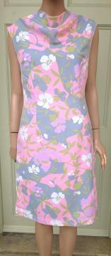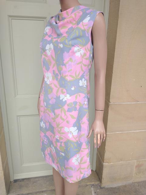 Pretty 1960s DUMARSEL label Twiggy style fitted sheath dress sleeveless. Pattern is a soft pink, green, blue & white floral print and the dress has a drape neckline with a back zip fastener. Fully lined inside. In excellent condition. Modern UK size 12-14 Chest: 38" (96cm) Waist: 32" (81cm) Hips: 40" (101cm) Length: 38" (96cm) All measurements are approximate.