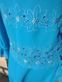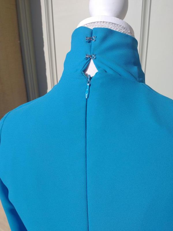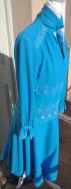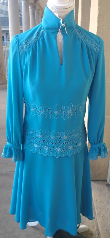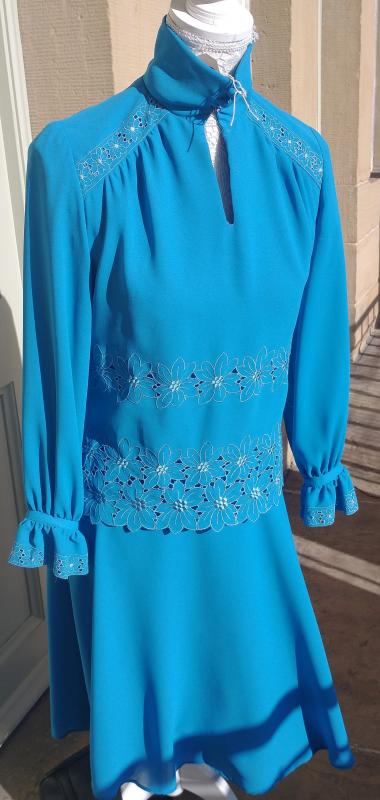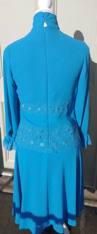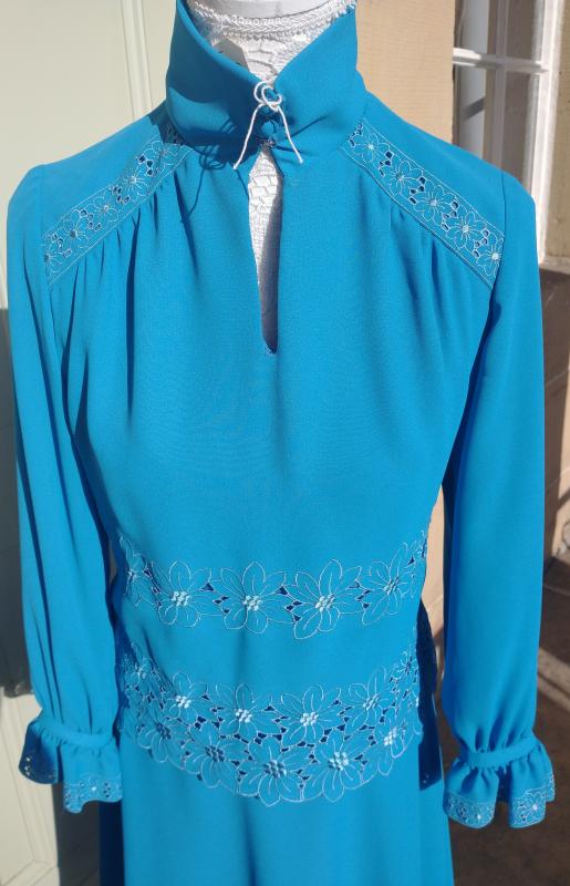 Beautiful 1970s ANN MICHAEL designer turquoise colour long sleeve sheath dress with a high collar v-neckline. Textured polyester. Front button up collar. It has an embroidered flower pattern on the shoulders, waist & hips and flouncy button up cuffs. It zips at the back as well as a hook and eye fastening for the high collar. In excellent condition. Modern UK size 10-12 Chest: 34" (86cm) Waist: 30" (76cm) Hips: 34" (86cm) Length: 41" (104cm) Sleeve arm length: 22" (56.5cm)