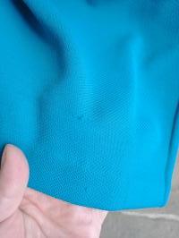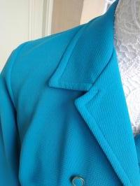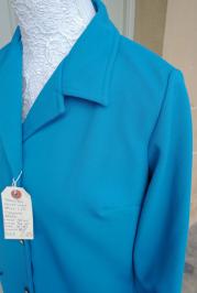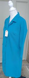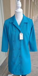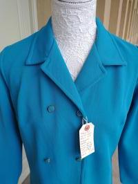 1970s house coat style turquoise colour dress with 3/4 sleeves. Has a button up front which gives the appearance of being double breasted and a shirt style collar. In very good condition apart from a few clicks near the bottom hem of the dress as photographed. UK modern size: 14-16 Chest: 38"-40" (96cm-101cm) Waist: 34"-36" (86cm-91cm) Hips: 36"-38" (91cm-96cm) Length: 38" (96cm)