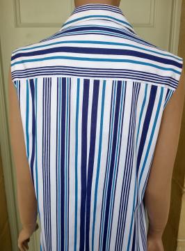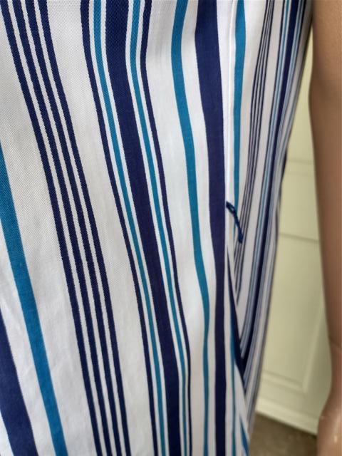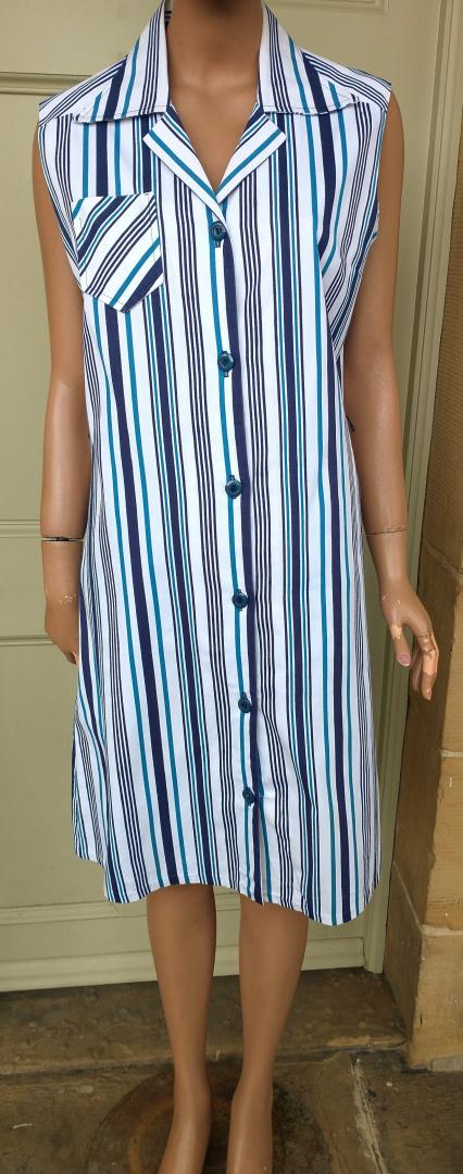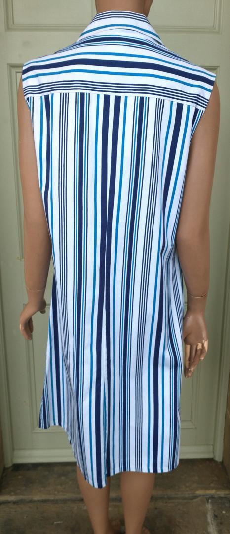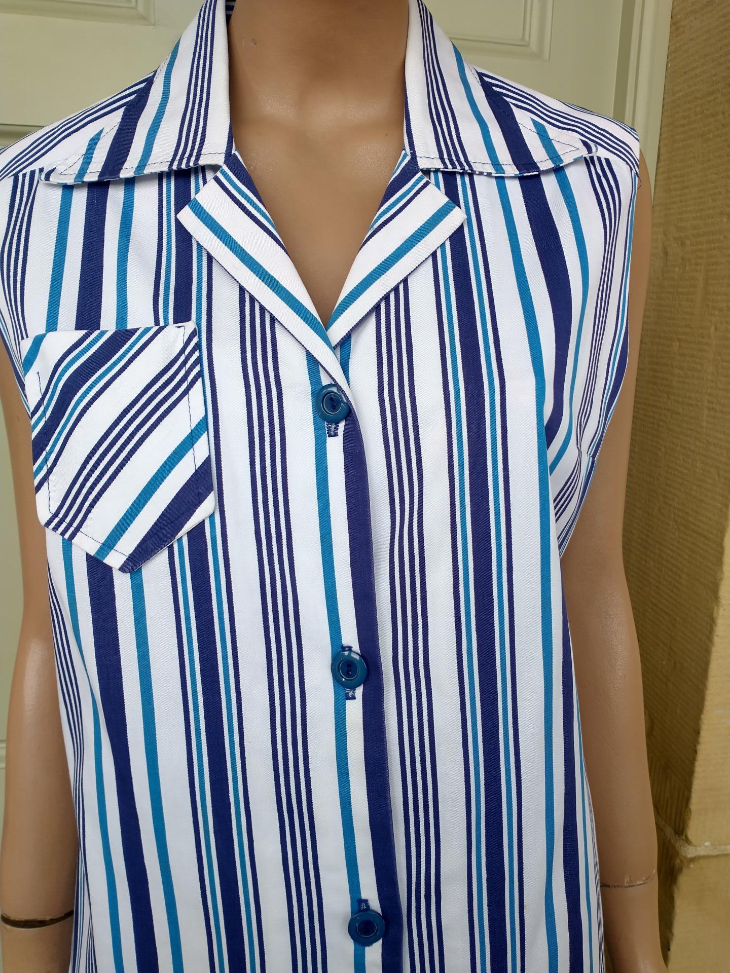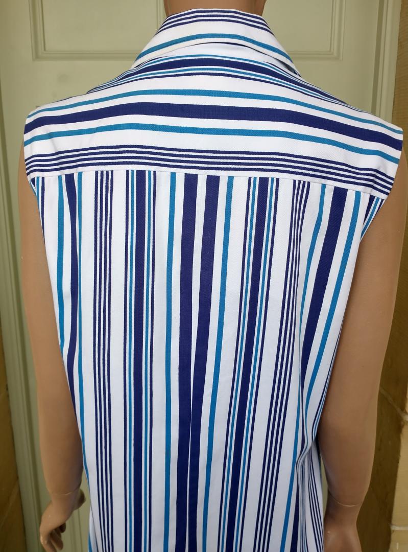 1970s ST MICHAEL long sleeveless white pinafore style shift dress with shades of different blues pin stripe design. 100% cotton. Full button up front. Big notched collars & a single breast pocket. No belt. Made in the UK. In excellent condition. Modern UK size 12-14 Chest: 38"-40" (96cm-101cm) Waist: 30" (76cm) Hips: 40"-42" (101cm-106cm) Length: 39.5" (101cm) All measurements are approximate.