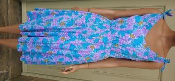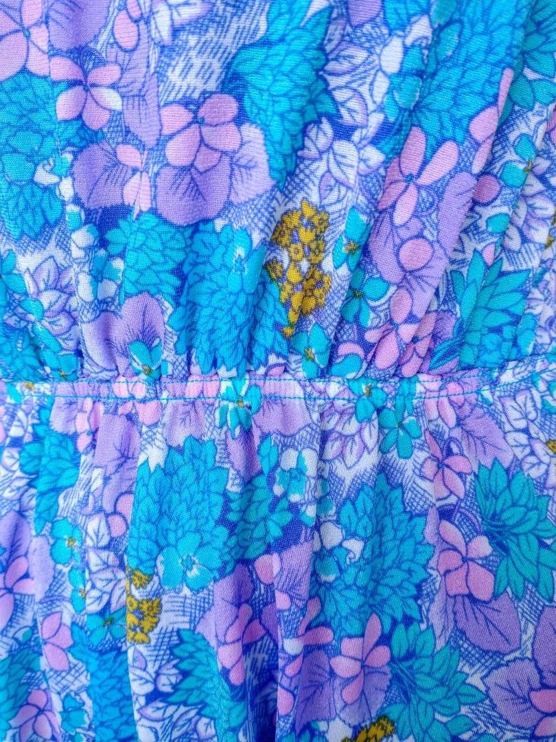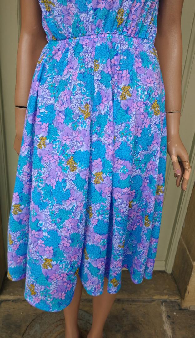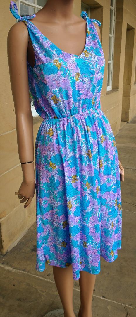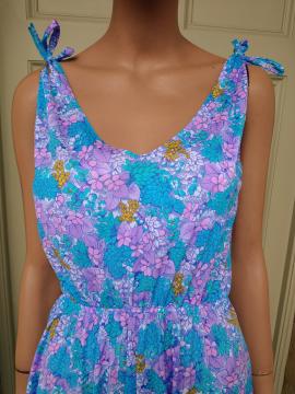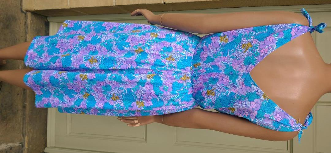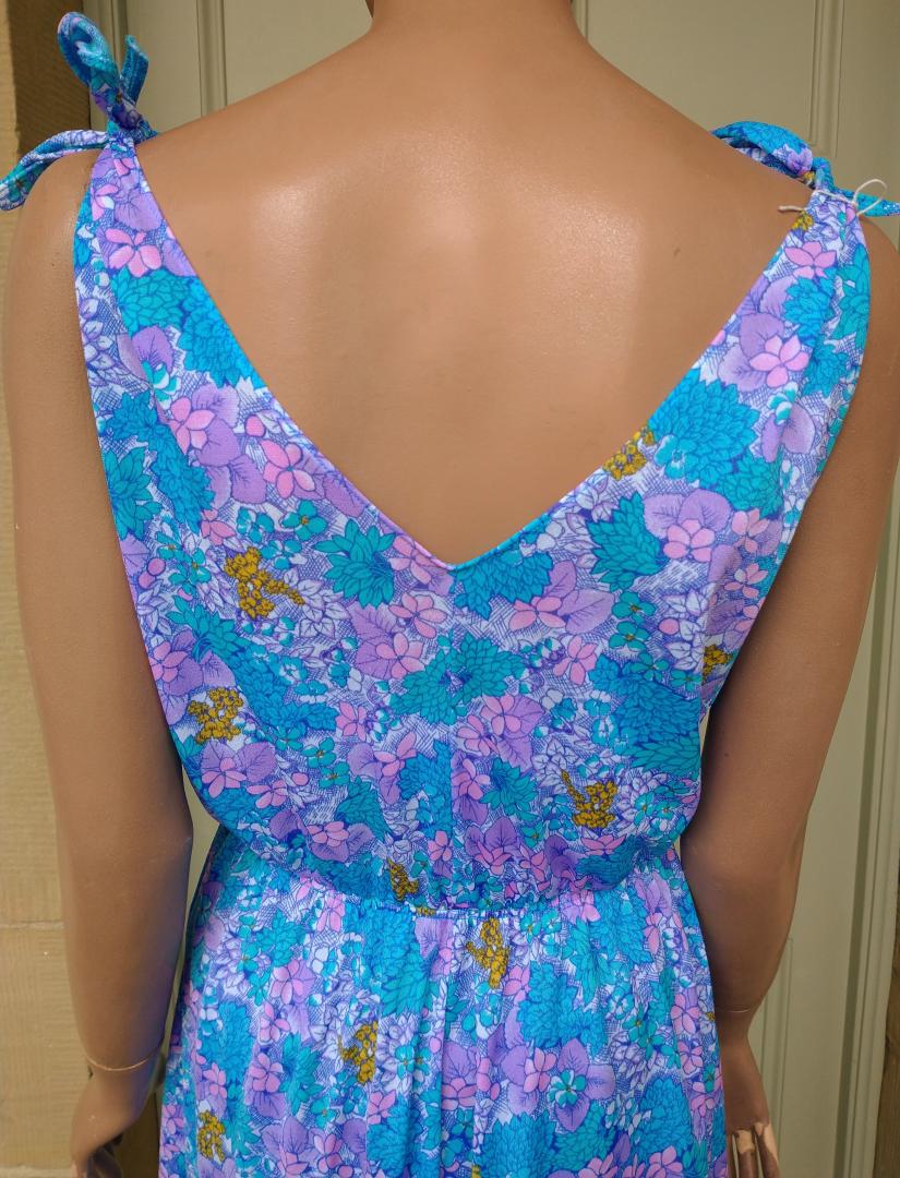 Pretty 1980s sun dress by Bleyle Italian made in blue/purple/pink tones. Floral pattern with tie bow straps. Plunge v-neckline at front & back. Elastic gathered waist. Light fabric. 100% nylon. In very good condition. Modern UK size 10 Chest: 38" (96cm) Waist: up to 32" max (81cm) Hips: 40" (101cm) Length: 41" (104cm) All measurements are approximate.