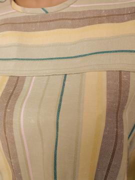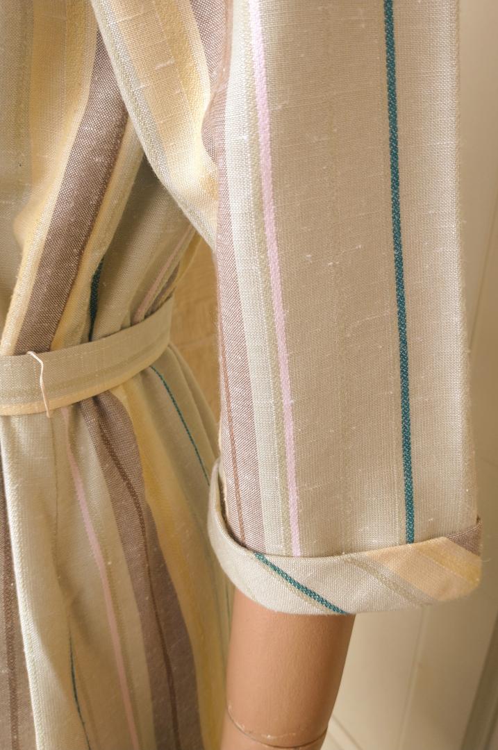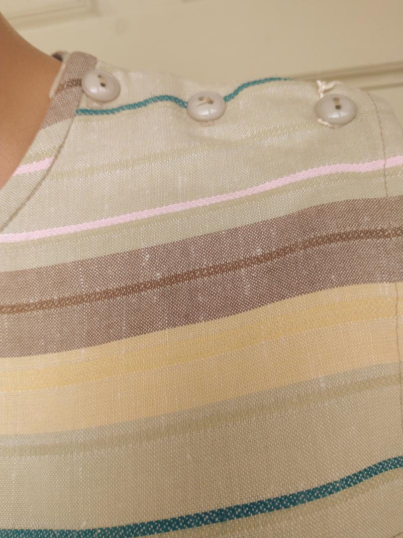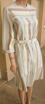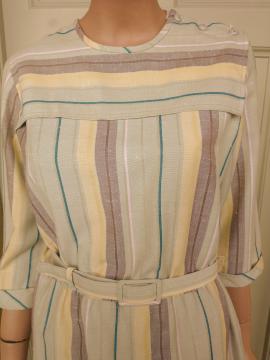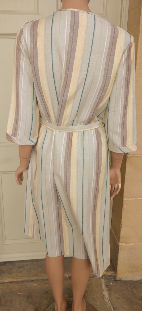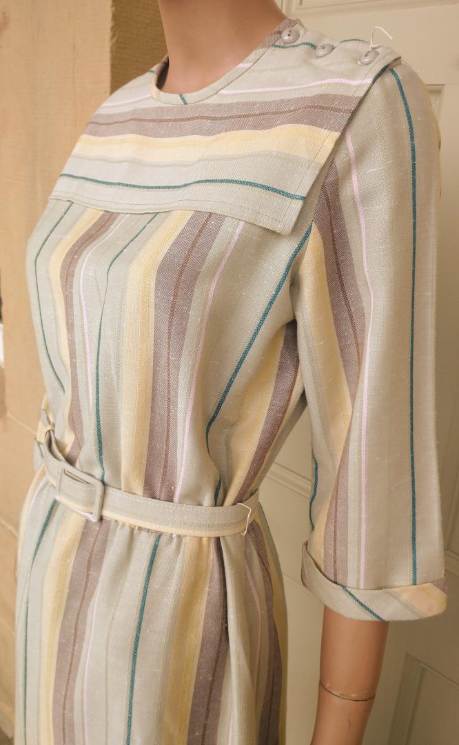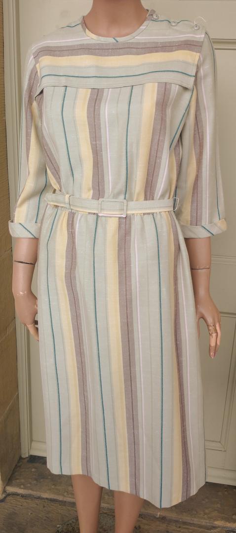 Fab 1980s Littlewoods brand apron neckline sheath dress in a pale green with both horizontal & vertical stripes and original belt. The stripes are pink, brown and yellow. The dress has 3/4 sleeves with small turn up cuffs and 3 x buttons on the left shoulder. In excellent condition - no marks or damage. Modern UK size 12 Chest: 36" (91cm); Waist: up to 36" (91cm); Hips: 42" (107cm); Arm: 17" 43.5cm); Length: 44" (112cm) measured from the top of the collar at the back; All measurements are approximate.