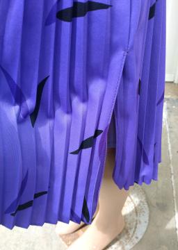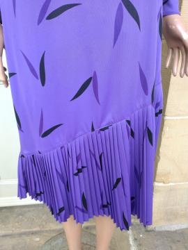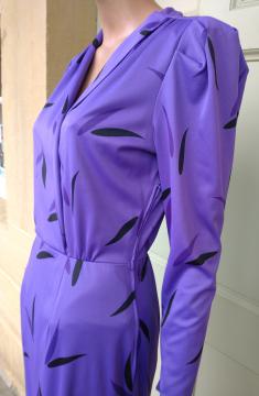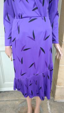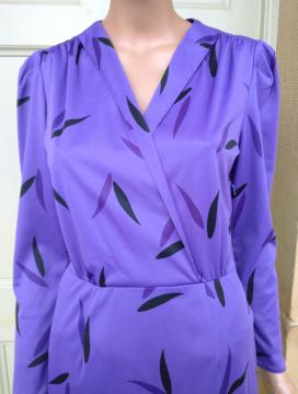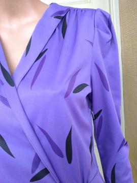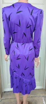 Stunning 1980s purple fitted dress wrap around style bodice. Has a black & purple leaf design with a small pleated bottom & a side split. Has 3/4 sleeves - think Joan Collins power dressing! In excellent condition. Modern UK size 8-10 Chest: 34" (86cm) Waist: 28" (71cm) Hips: 36" (91cm) Length: 45" (114cm) Arm: 24" measured from top of shoulder (61.5cm)
