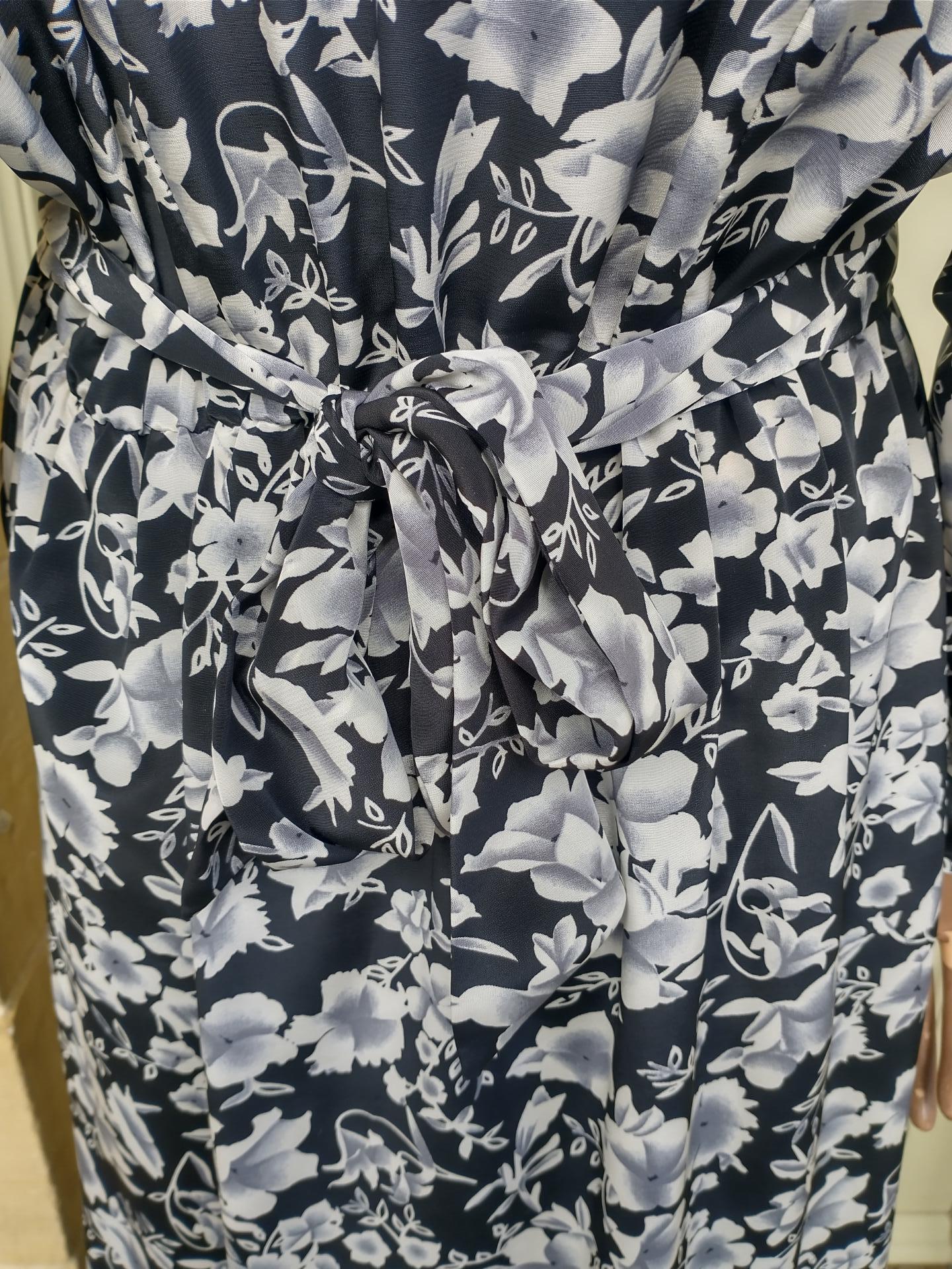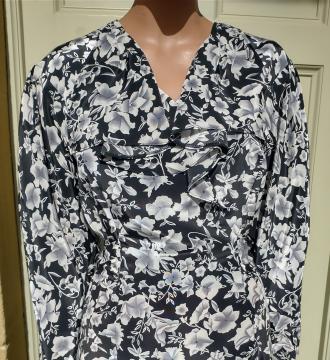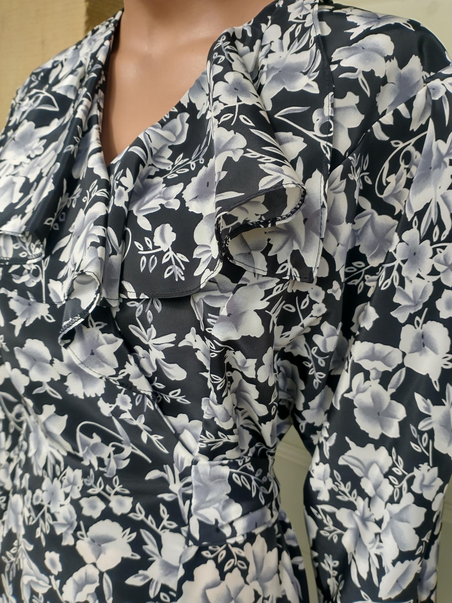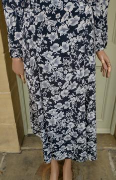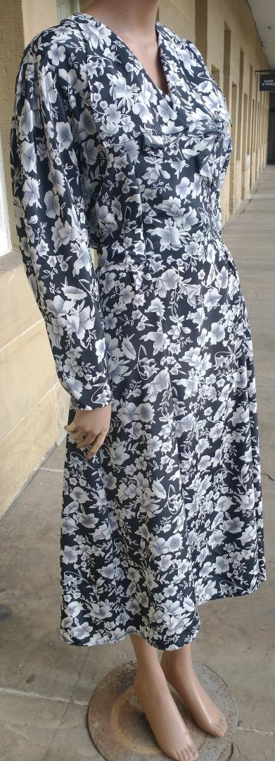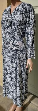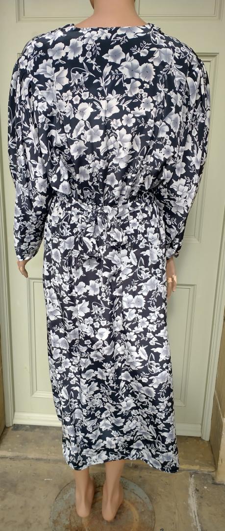 1990s Paul Poly wrap around style dress black with white blossom pattern. Has a ruffle frilly front, 3/4 sleeves and a tie back belt. Elastic waist. Made in the UK 100% polyester. In excellent condition. Modern UK size 10-12 Chest: 34"-36" (86cm) Waist: up to 32" (81cm) Hips: 42" (106cm) Arms: 24" (61.5cm) Length: 49" (124cm) All measurements are approximate.